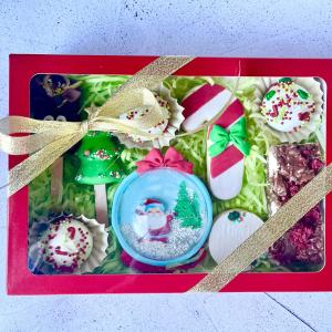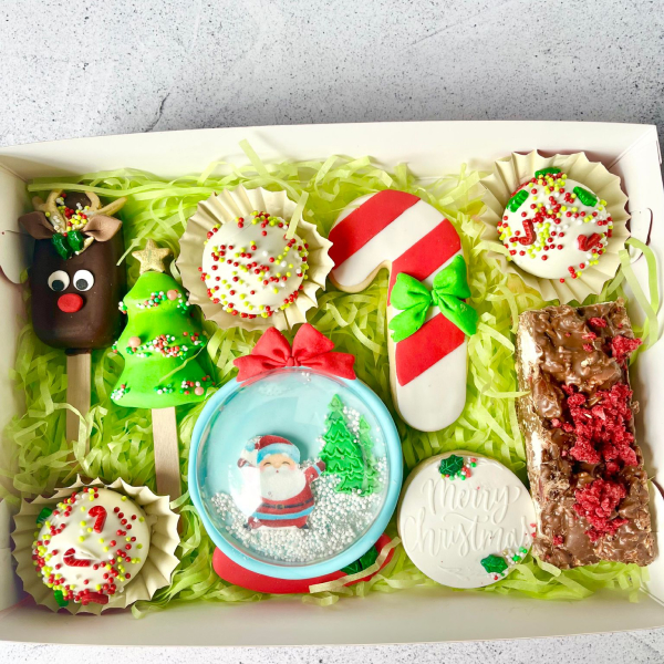 This treat box is the perfect way to say thank you. Beautifully presented in our red Christmas box, inside you will find vanilla cookies, cakesicles, our signature rocky road and cake pops. Our most love bites all in one box!