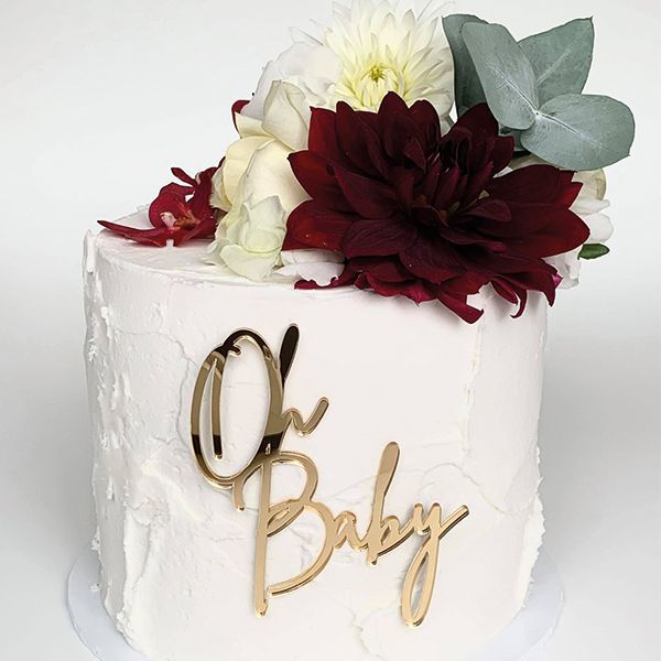 SOLD OUTBaby Shower or Gender Reveal it can be either, White rustic buttercream finish with beautiful fresh bloom and gold mirror "Oh Baby" topper. Flowers will be match to colors required and may vary depending on seasons.