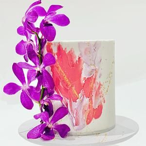 SOLD OUTLet your celebration cake make a statement. The paint palette cake features your favorite color and gold paint splatter. Fresh blooms will be hand chosen to match and contrast your color choice.
